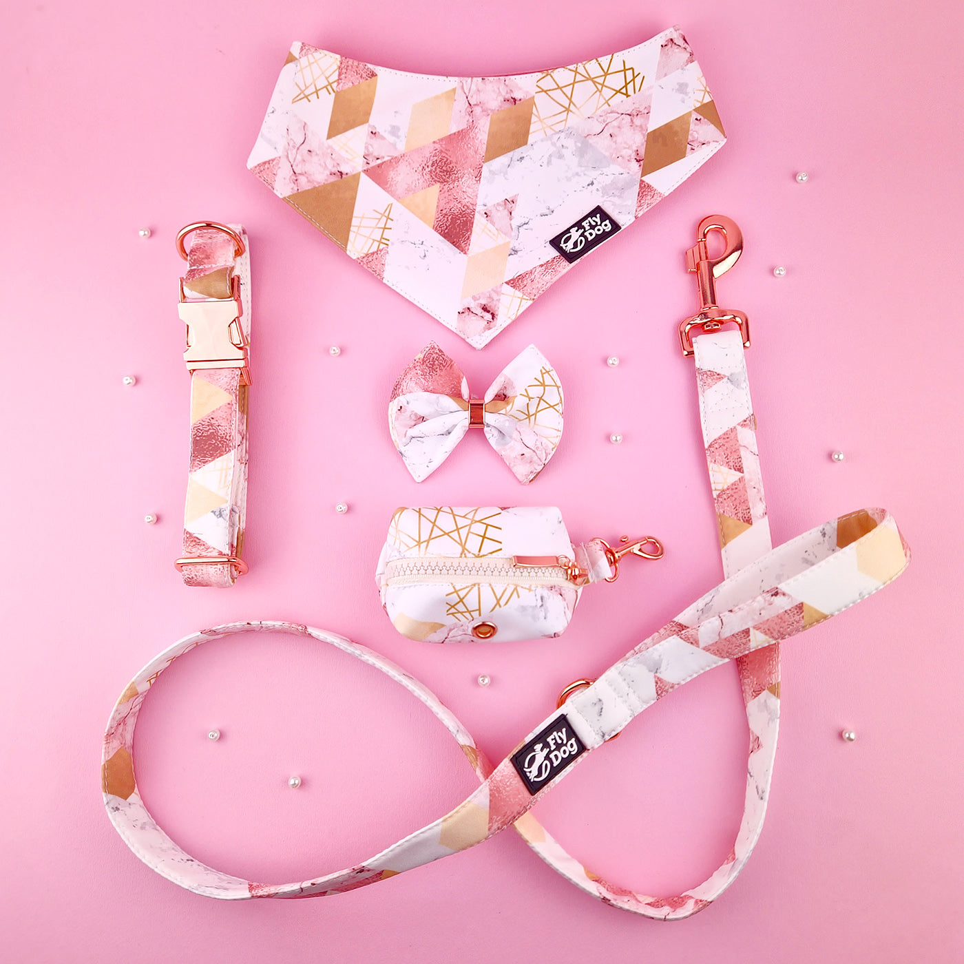 Setul este realizat din material softshell rezistent la apă de calitate superioară, cu accente din oțel inoxidabil în finisaje de aur roz, argint sau negru mat. Această colecție combină perfect durabilitatea cu estetica elegantă pentru prietenul tău iubit.